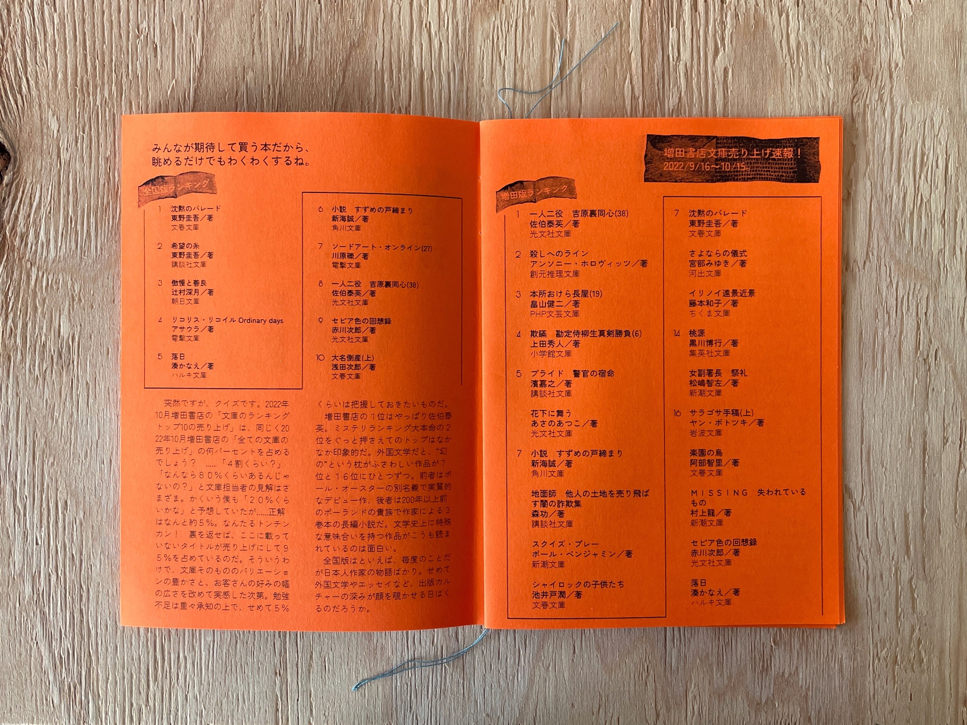 ・増田書店文庫売り上げ速報!2022/9/16~10/15。
